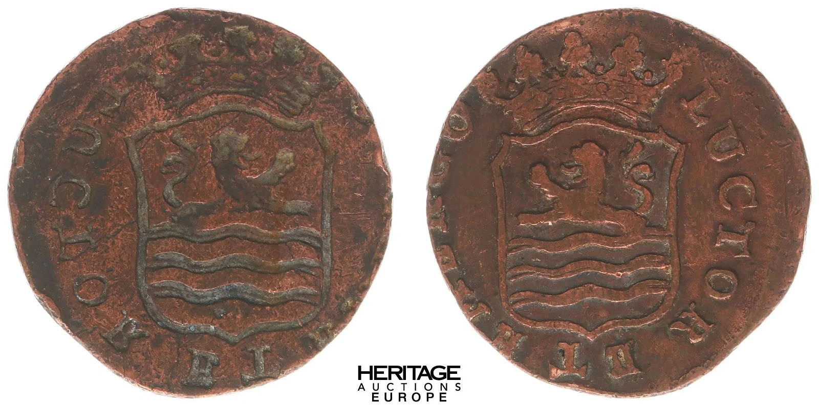 Keerzijde: Een gekroond wapenschild met leeuw in de golven..Tekst: LUCTOR ET EMERGO (of variant). Dit betekent: ik worstel en kom boven.