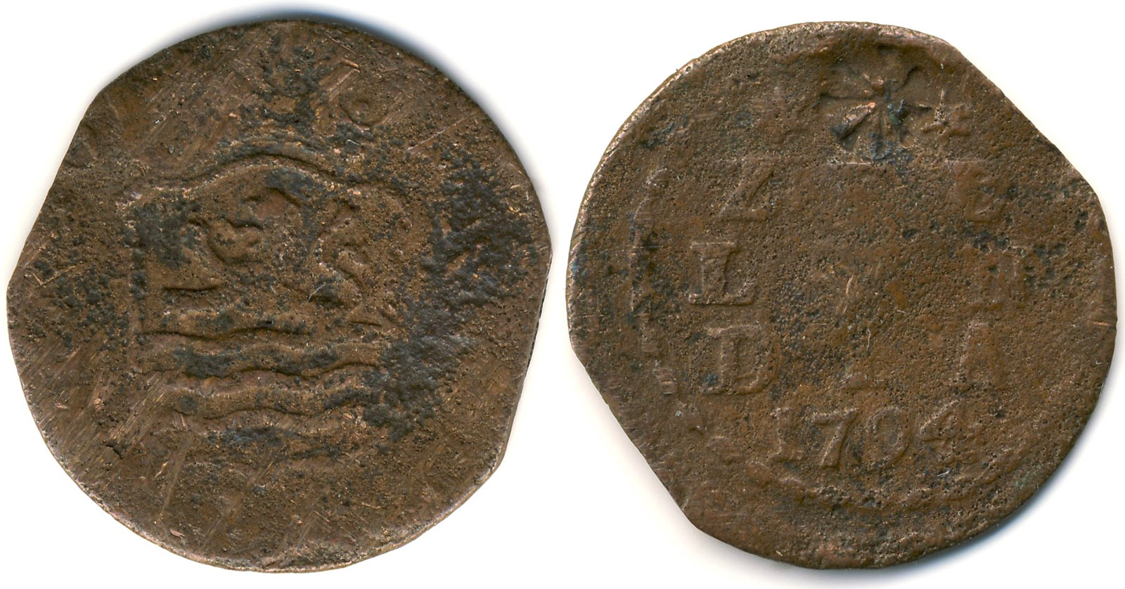Voorzijde: Een cirkel van streepjes met daarin ✶♜✶ en daaronder ZEE LAN DIA in drie regels en het jaartal. ( Op deze munt niks meer te zien, amper het jaartal )