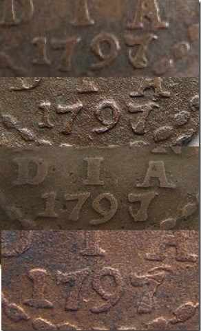 Van dit type komen veel stempelwijzigingen voor welke in het algemeen vrij gemakkelijk te ontdekken zijn. De stempelwijziging 1797/96 lijkt zelfs meer voor te komen dan het ‘gewone’ jaartal 1797. Een exemplaar uit 1794 is bekend met de klop rad of rozet, zie HIER een afbeelding. Deze klop is ook voorgekomen op een Westfriese duit 1739 en op een Gelderse duit van het type GEL.147 (waarschijnlijk 1761).