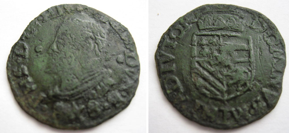 Keerzijde: Gekroond wapenschild met meerdere kwartieren. Tekst: ARCHID.AVS.BVRG.BRAD.Zc ( of variant ). Voluit: archidux Austria Burgundie Brabant zc: aartshertog van Oostenrijk-Bourgondië en Brabant.