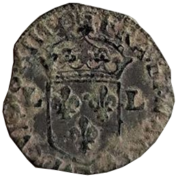 Gepubliceerd inKoninkrijk Frankrijk: douzain, illegale uitgifte van de protestanten. Lodewijk XIII, koning van Frankrijk, 1610 – 1643 ( H )