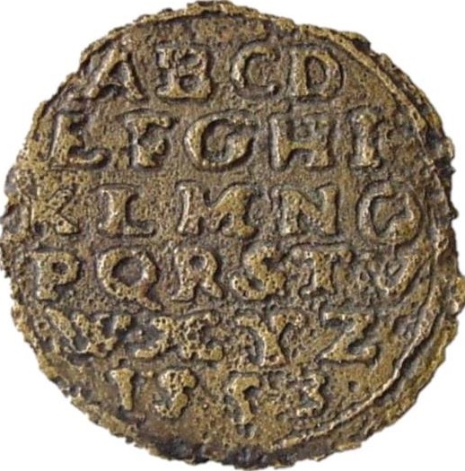 Gepubliceerd inRekenpenning Neurenberg, type Rekenmeester, Damian Krauwinckel 1543 – 1581. Van de “1553” serie, waarbij het alfabet in 5 regels staat en niet in een frame.