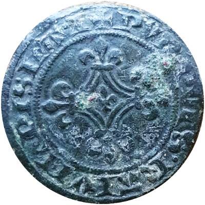 Gepubliceerd inRekenpenning Frankrijk, type ” Staande koning onder baldakijn met wapenschild “, Philippe de Valois of Jean le Bon, ca. 1350.