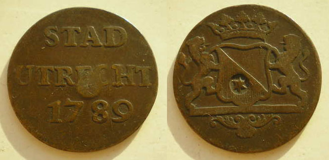 Voorzijde: Een wapenschildje met twee kwartieren gelegen op een scheef geplaatst stokkenkruis. De armen van het stokkenkruis kunnen op verschillende plaatsen de binnenrand en de tekst doorbreken. Boven het wapen een kroon en aan weerszijden de cijfers van het jaartal. Tekst: