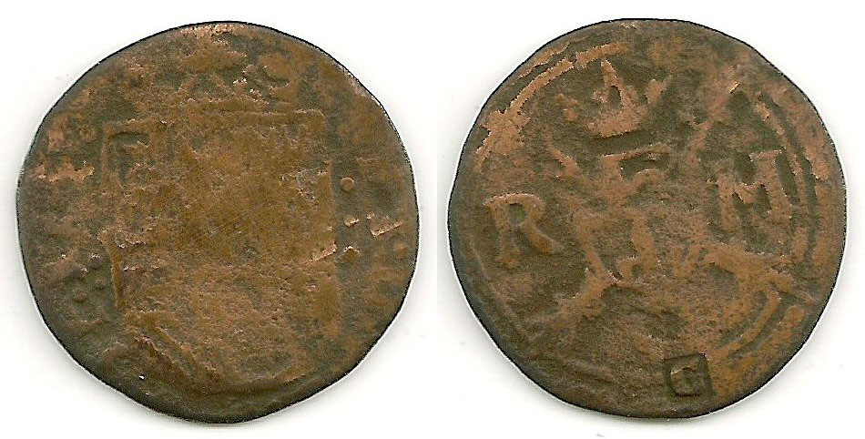 Dit zijn de laatste munten te Roermond geslagen. Volgens rekeningen zijn zij gemunt in 1666 en van 1673 t/m 1679. In 1682 liet de Spaanse koning Karel II de stad formeel weten dat zij niet langer munt mocht slaan omdat de kwaliteit en controle te wensen overliet. Van dit type is een duit bekend met een klein klopje in de vorm van een letter G in een vierkantje, zie hier een afbeelding.