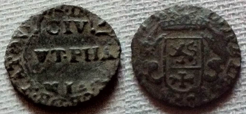 Keerzijde: Gekroond stadswapen, vastgehouden door twee leeuwen. De laatste twee cijfers van het jaartal staan tussen de kroon boven het wapen of onder het wapenschild.