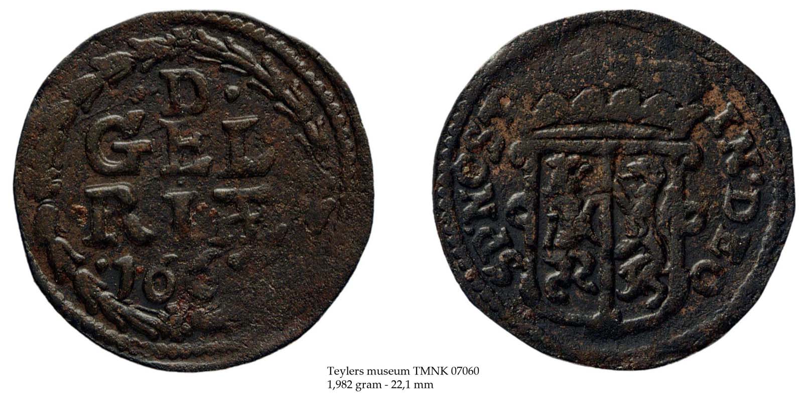 Voorzijde: Een tulpkrans met daarin de tekst in 4 regels ·D· / GEL / RIÆ / 1681· Dit is voluit: ducatus Gelriæ, en betekent: hertogdom Gelderland.