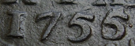 Op 9 juli 1754 werd, op voorspraak van de Staten van Gelderland, per resolutie bekend gemaakt om niet langer paspoorten te verlenen voor de invoer van duitplaatjes uit het buitenland (veelal uit zweden). Voortaan zouden de duitplaatjes op de binnenlandse kopermolens gekocht moeten worden. Uitzonderingen konden worden gemaakt in geval dat de kwaliteit, de prijs of de kwantiteit te wensen overliet. Hier een det detail van een exemplaar met het jaartel 1755 waarbij de laatste 5 ergens overheen lijkt te staan. Op dit exemplaar is niet goed te zien of dat ook werkelijk het geval is maar mogelijk heeft iemand een vergelijkbaar exemplaar? Ergens in 1756 is men over gegaan van een dikke, gansachtige kraanvogel naar een dunne kraanvogel met grotere neerwaarts gerichte snavel als muntmeesterteken. Het jaar 1756 komt dan ook met beide typen kraanvogels voor.