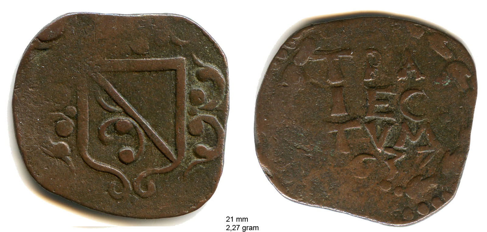 Keerzijde: Het stadswapen van Utrecht rondom versiert met lelievormen. In het kwartier linksonder een vlamversiering (4).