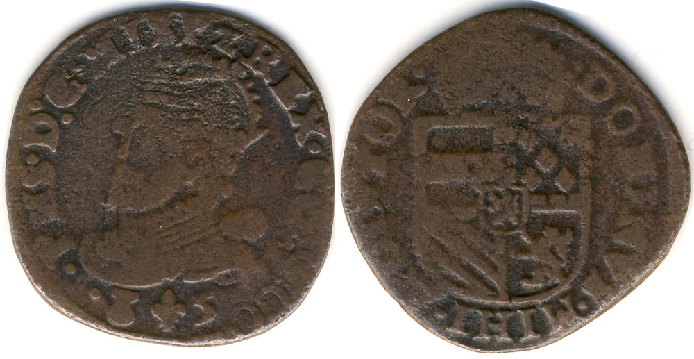 Voorzijde: Gekroond borstbeeld van Philips II naar links. Tekst: PHS. D:G. HIS. Z. REX. COM. FLA (of variant). Onder het borstbeeld staat het tot twee cijfers afgekorte jaartal, gesplitst door een lelie. De tekst is voluit: Philippus Dei gratia Hispaniarum z rex comes Flandrie, wat betekent: Philips, bij Gods gratie koning van Spanje en graaf van Vlaanderen.