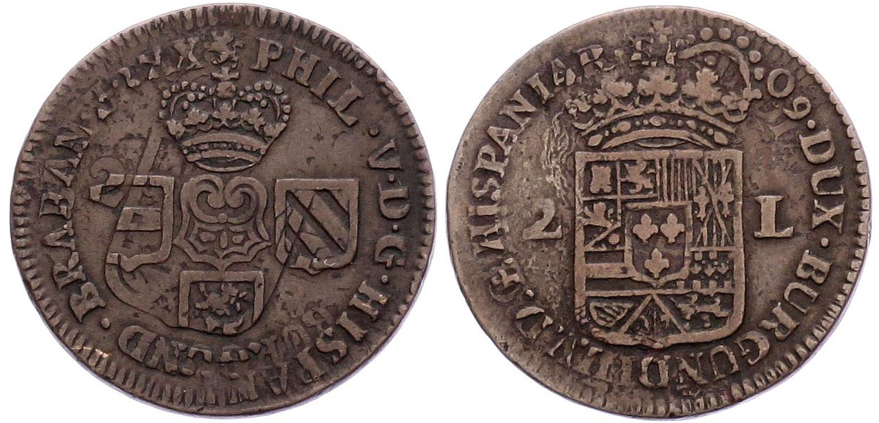 Keerzijde: Gekroond wapenschild van Philips V, de kroon onderbreekt het omschrift, ter weerszijde de waardeaanduiding 2 – L (2 liard/ 2 oorden). Tekst: DUX.BURGUND.BRABAN.Z. 17 – 09