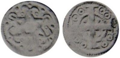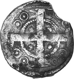 Keerzijde: In een dubbele parelcirkel onderbroken door een lang gevoet kruis telkens twee gepunte ringen ter vervanging van enige legende. In elk kwartier een parel.