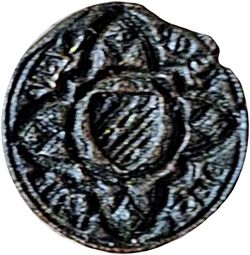 Keerzijde: Verweven monogram MA van Maria. Daarboven een kroon en onderaan drie nagels. De rest is versiering. I en R staan apart, betekenis tot hiertoe onbekend.